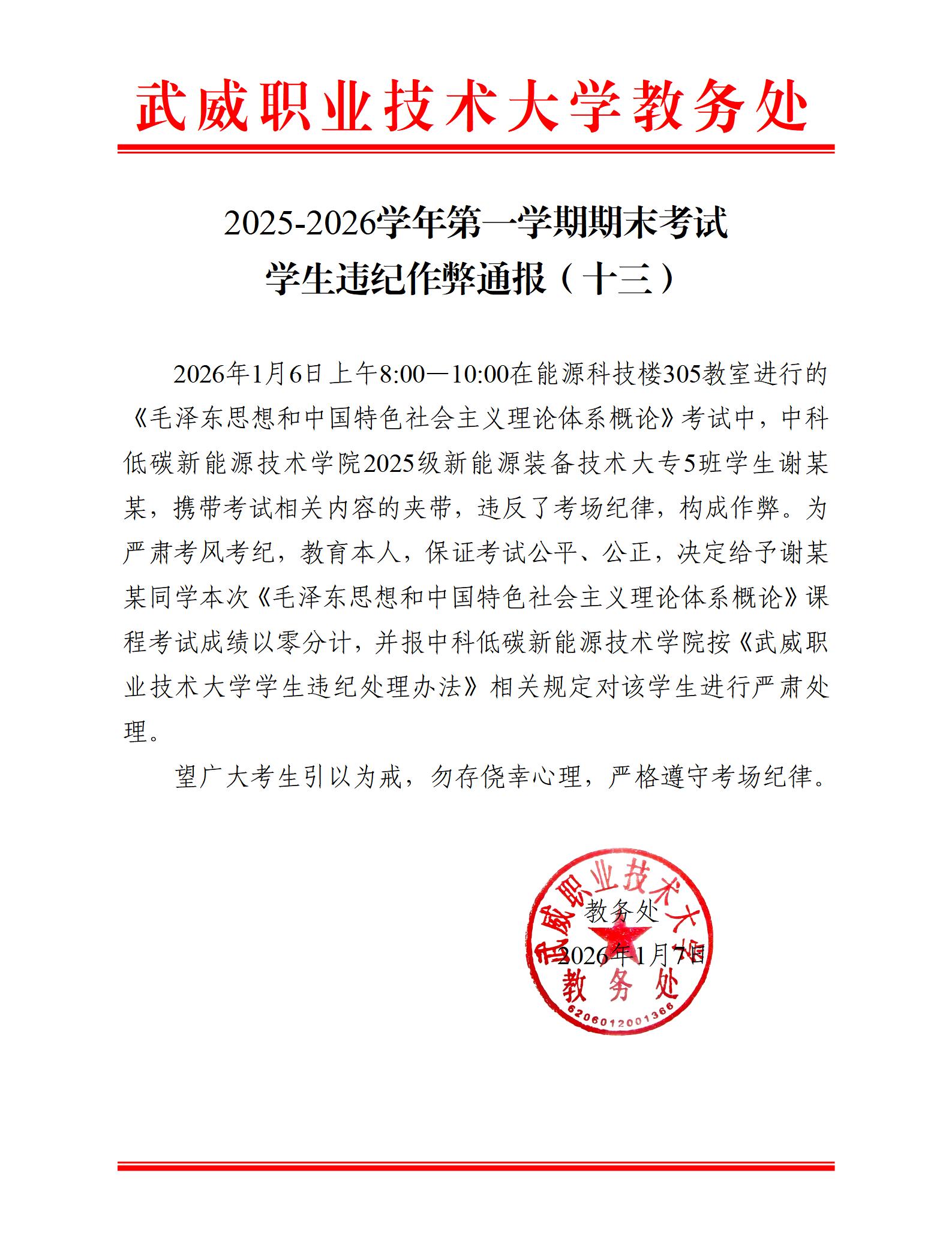 2025-2026學年第一學期期末考試學生違紀作弊通報(十三)