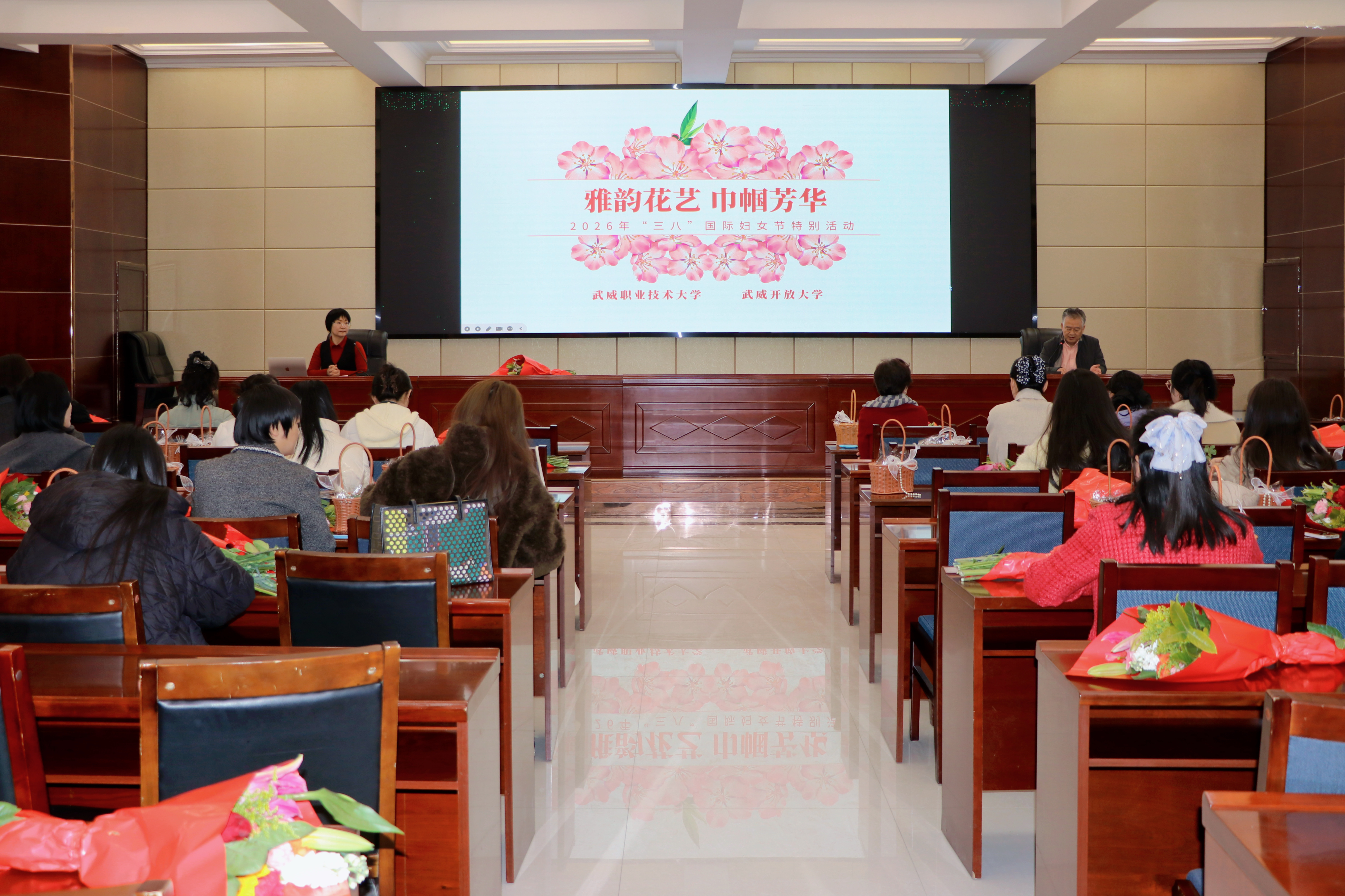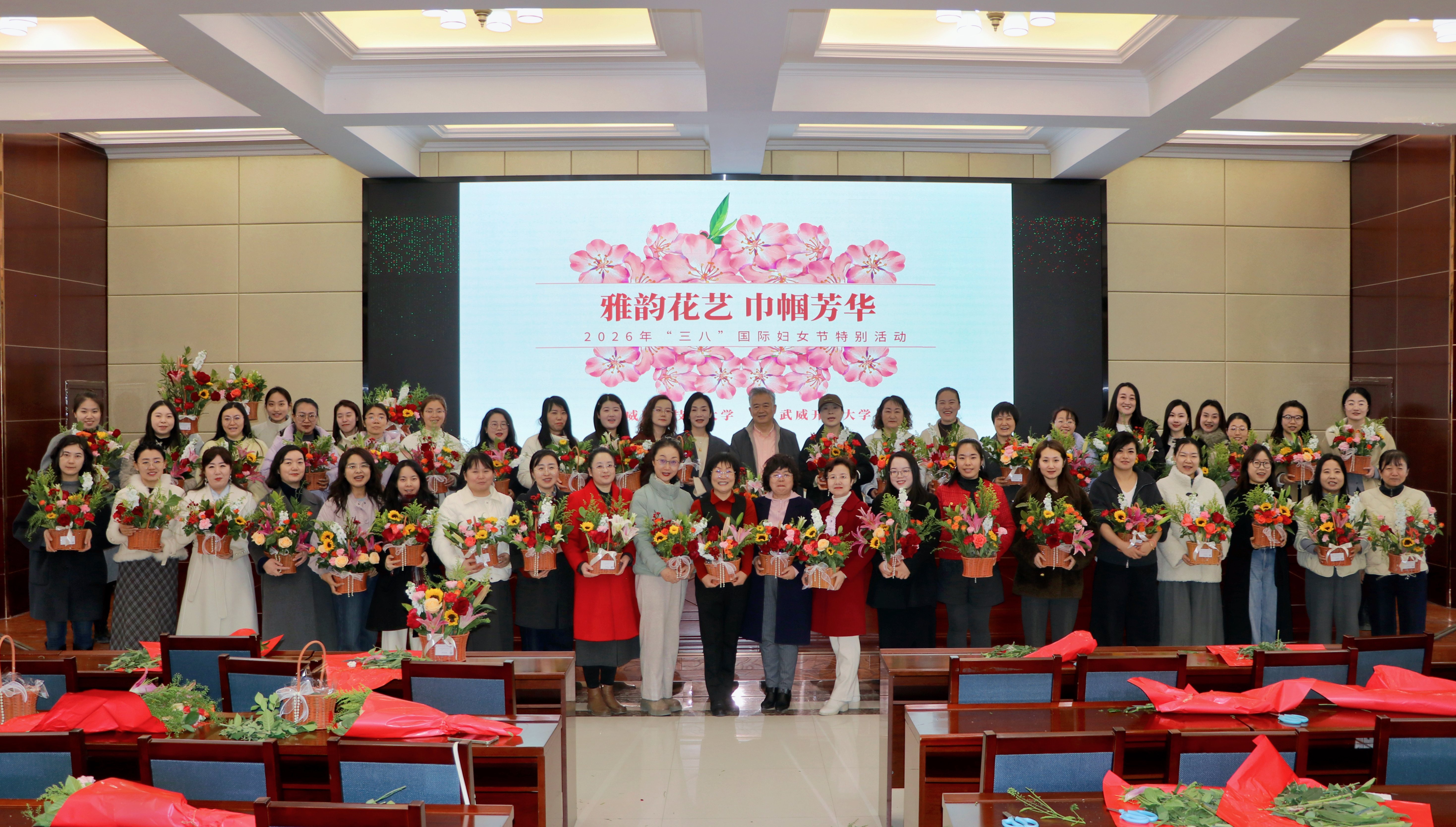 為慶祝第116個(gè)“三八”國際勞動(dòng)?jì)D女節(jié),3月6日,學(xué)校工會(huì)聯(lián)合武威開放大學(xué),在行樹樓北側(cè)報(bào)告廳組織開展了以“雅韻花藝?巾幗芳華”為主題的插花活動(dòng),130余名女教職工歡聚一堂、共赴花約。黨委委員、副校長(zhǎng)何毅出席活動(dòng)并致辭。