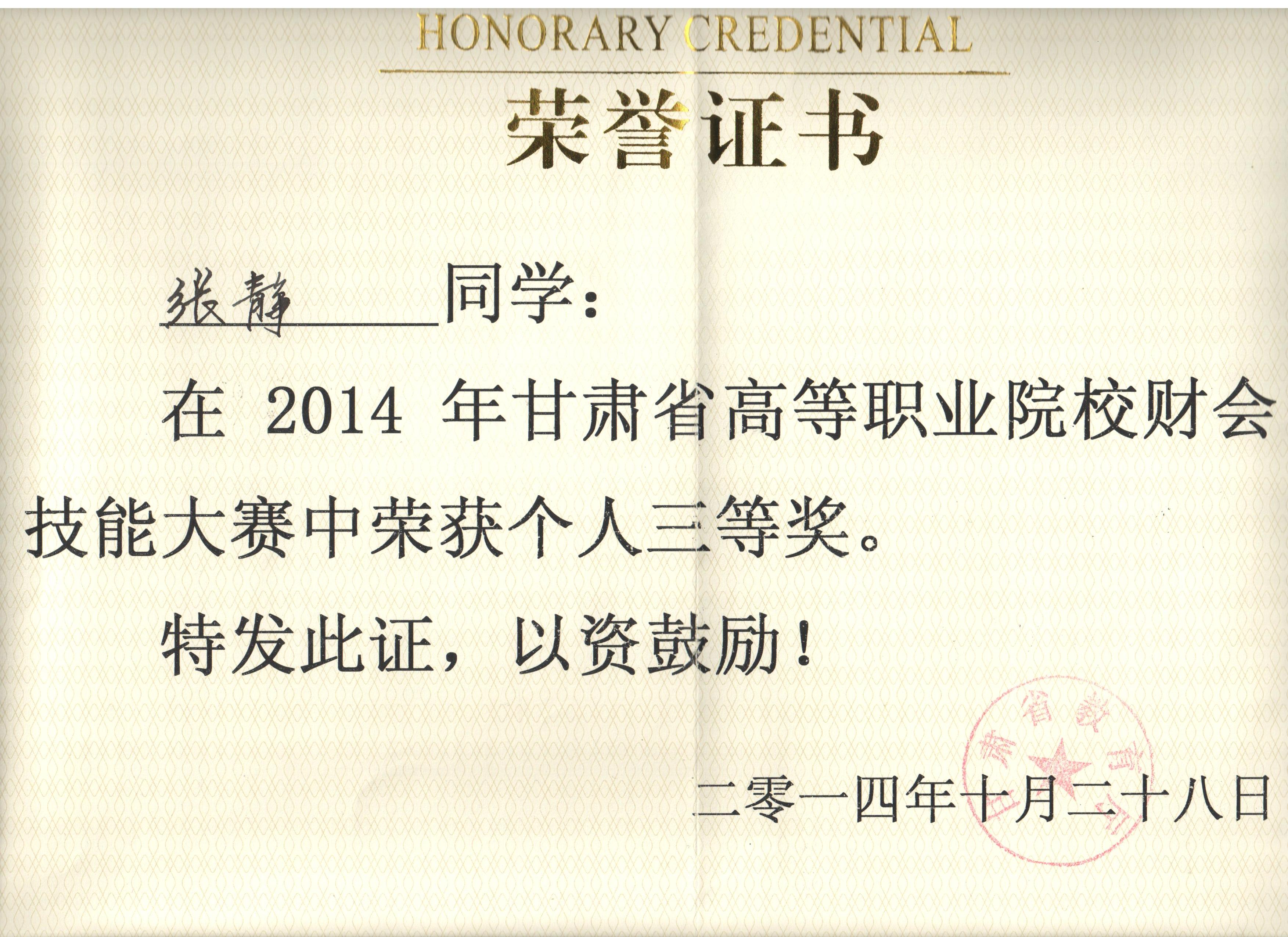經(jīng)濟(jì)管理系李惠蘭、賀德赟老師指導(dǎo)我系會計(jì)專業(yè)學(xué)生參加2014年甘肅省高等職業(yè)學(xué)院財(cái)會技能大賽,榮獲優(yōu)秀獎。