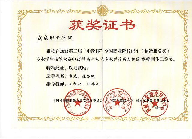 學(xué)院自接到《關(guān)于舉辦第三屆“中銳杯”全國(guó)職業(yè)院校汽車(制造服務(wù)類)專業(yè)學(xué)生技能大賽的通知》之后,學(xué)院領(lǐng)導(dǎo)對(duì)本次比賽高度重視,汽車工程系全體老師及學(xué)生對(duì)本次比賽更是充滿信心,汽車工程系專門召開了系部會(huì)議,組織討論了本次比賽的參賽方案,并確定了實(shí)訓(xùn)內(nèi)容、時(shí)間、地點(diǎn)和指導(dǎo)老師。經(jīng)過(guò)了各班推選、測(cè)試選拔、預(yù)賽、培訓(xùn)等環(huán)節(jié),最終決定由11級(jí)汽車檢測(cè)與維修中銳班陳萬(wàn)明和曹杰兩位同學(xué)參加本次大賽。本次技能大賽分預(yù)選賽和決賽兩個(gè)賽程,預(yù)選賽采用遠(yuǎn)程視頻預(yù)選,經(jīng)過(guò)遠(yuǎn)程視頻預(yù)選賽的層層考核和選拔,我院參賽隊(duì)順利進(jìn)入決賽名單。1012日汽車工程系王鐸云和劉煒山兩位老師帶領(lǐng)參賽隊(duì),赴江西南昌參加決賽。在決賽中,經(jīng)過(guò)激烈角逐,我院兩位參賽選手在全國(guó)36支高職組隊(duì)伍中脫穎而出,獲得了團(tuán)體三等獎(jiǎng)的優(yōu)異成績(jī)。