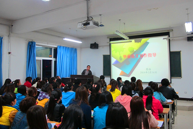 系主任晏素珍對(duì)本次畢業(yè)生畢業(yè)論文(設(shè)計(jì))做了三點(diǎn)要求,一是全體畢業(yè)生要高度重視畢業(yè)論文(設(shè)計(jì))的寫(xiě)作;二是嚴(yán)格按照指導(dǎo)教師的要求保質(zhì)保量的完成論文;三是每位指導(dǎo)老師對(duì)論文指導(dǎo)工作要認(rèn)真負(fù)責(zé)、耐心細(xì)致。蔡海老師做了題為《畢業(yè)生論文寫(xiě)作指導(dǎo)》的報(bào)告,主要從論文格式要求、文獻(xiàn)查詢(xún)方法、論文寫(xiě)作方法三個(gè)方面給同學(xué)們做了深入淺出的講解,受到同學(xué)們的熱烈歡迎。
