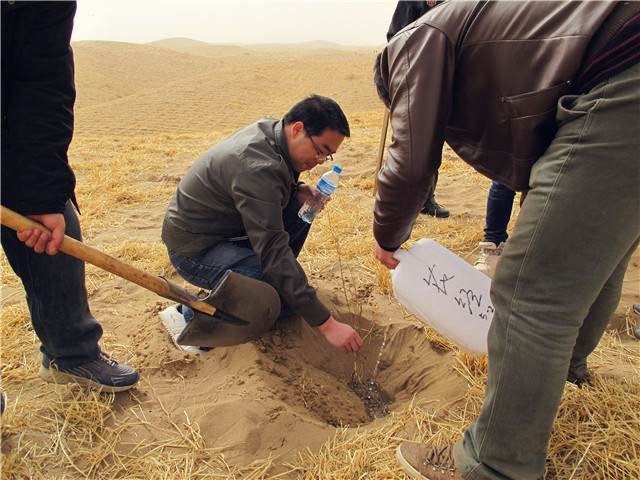 到達(dá)治沙造林現(xiàn)場(chǎng)后,師生按照劃分好的區(qū)域,帶上塑料桶,拿上土鉆,馬上投入到了緊張的勞動(dòng)中。在現(xiàn)場(chǎng)技術(shù)人員的指導(dǎo)下挖坑、栽種樹苗、澆水,完成了預(yù)定的治沙造林任務(wù)。