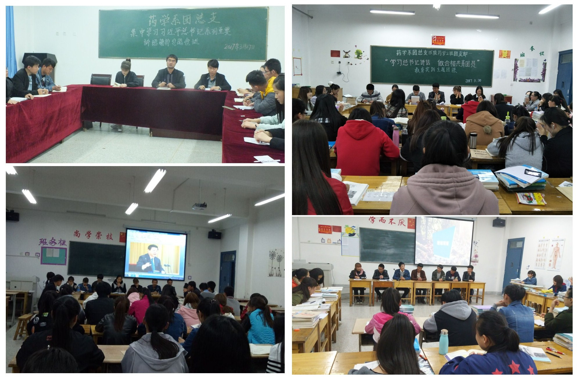 3月27至3月31日,藥學(xué)系團總支在系黨總支的周密安排和精心指導(dǎo)下,結(jié)合院團委開展“一學(xué)一做”教育實踐的總體部署,組織各班團支部在明遠樓各班教室集中開展了學(xué)習(xí) “習(xí)近平總書記在中國科學(xué)技術(shù)大學(xué)視察和在知識分子、勞動模范、青年代表座談會上重要講話精神”,并觀看相關(guān)教育視頻。視頻中,習(xí)近平總書記向廣大青年寄予厚望,專門對大學(xué)生提出了“做有理想、有追求的大學(xué)生,做有擔當、有作為的大學(xué)生,做有品質(zhì)、有修養(yǎng)的大學(xué)生”的明確要求,并勉勵廣大青年“踏踏實實做事,踏踏實實做人”。