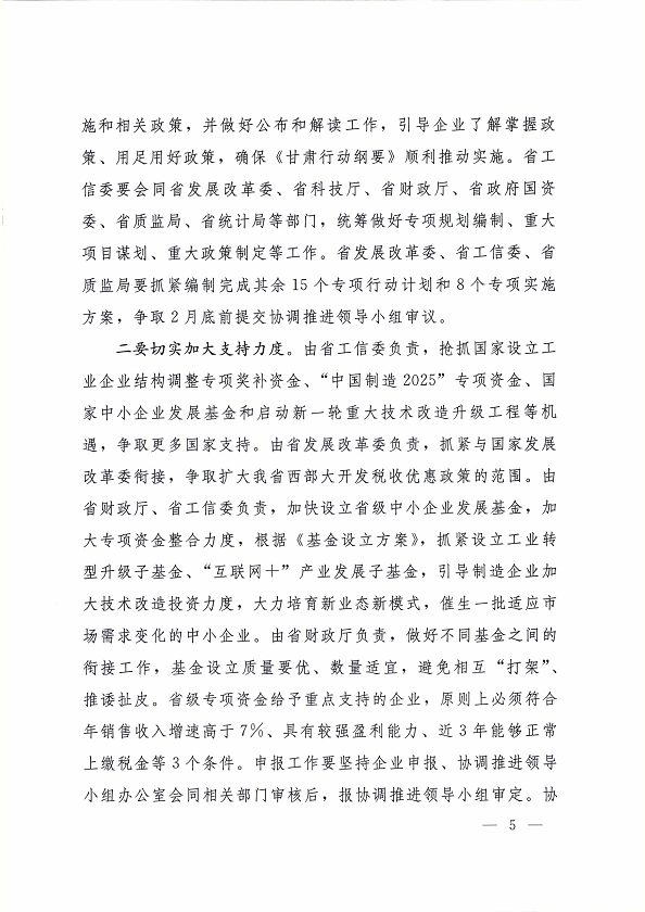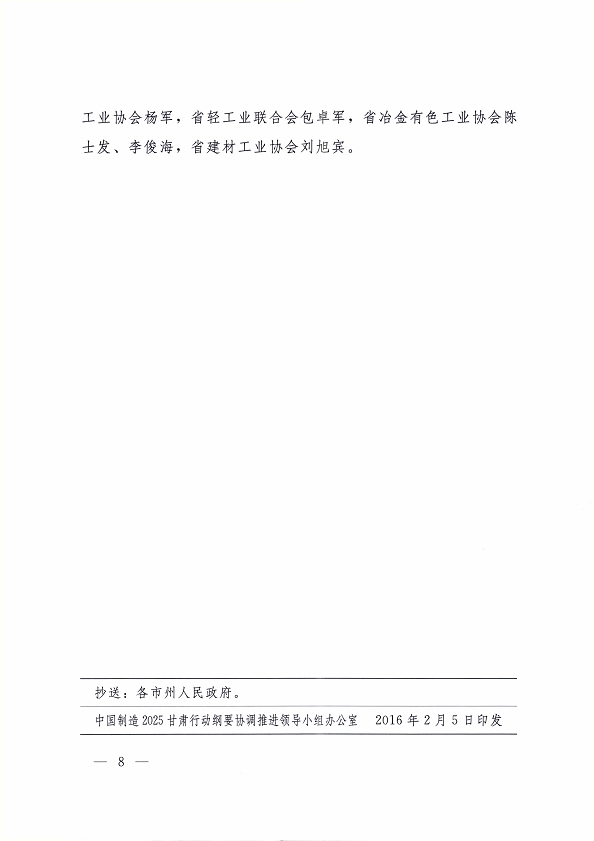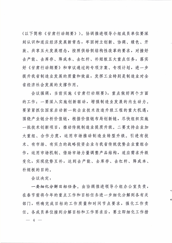 2016 年 1 月 30 日,省委副書記、省長、中國制造 2025甘肅行動綱要協(xié)調推進領導小組組長劉偉平主持召開了協(xié)調推進領導小組第一次會議,研究部署我省行動綱要的協(xié)調和推進工作。現(xiàn)將《中國制造 2025 甘肅行動綱要協(xié)調推進領導小組第一次會議紀要》轉發(fā)你們。