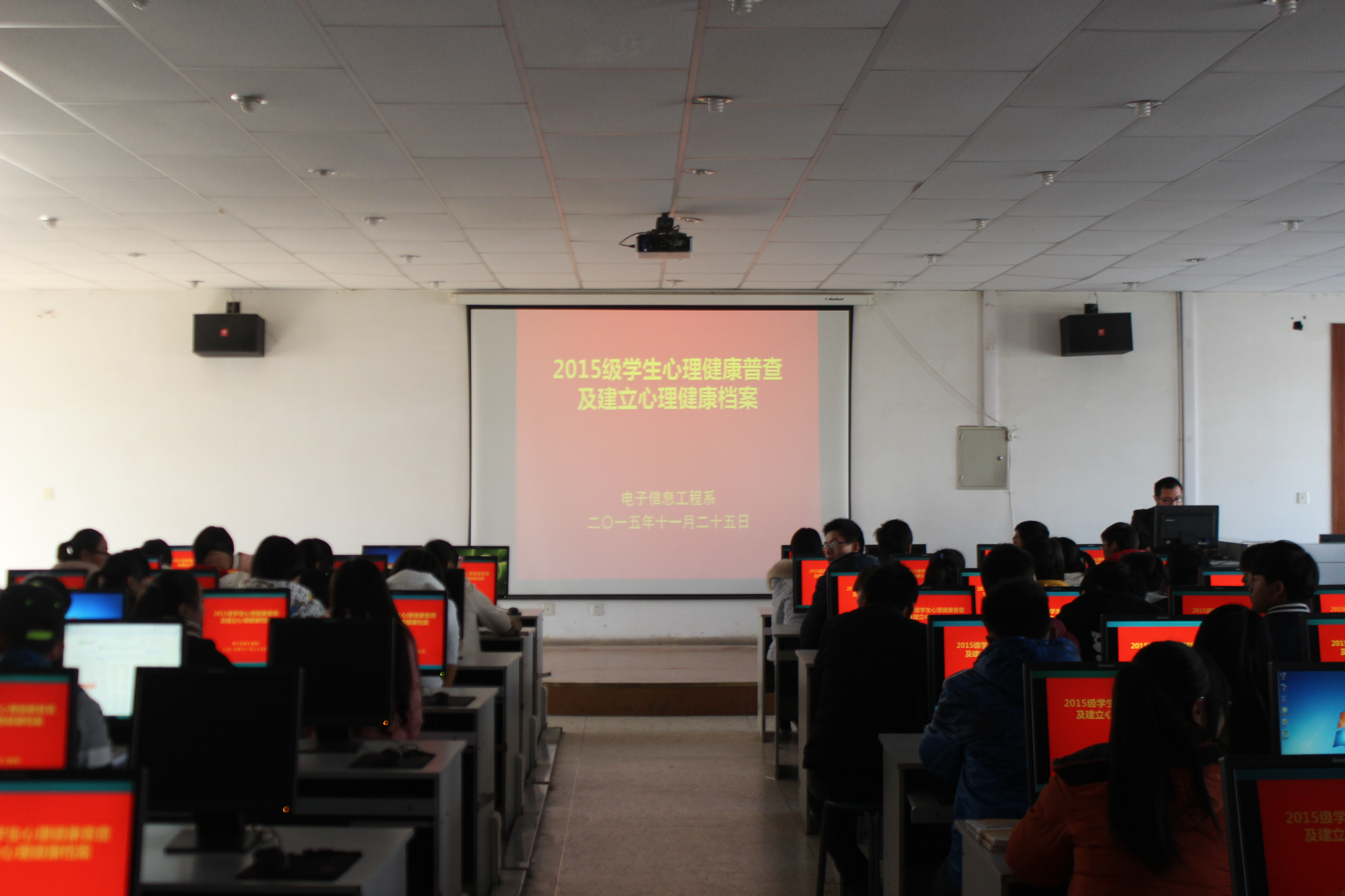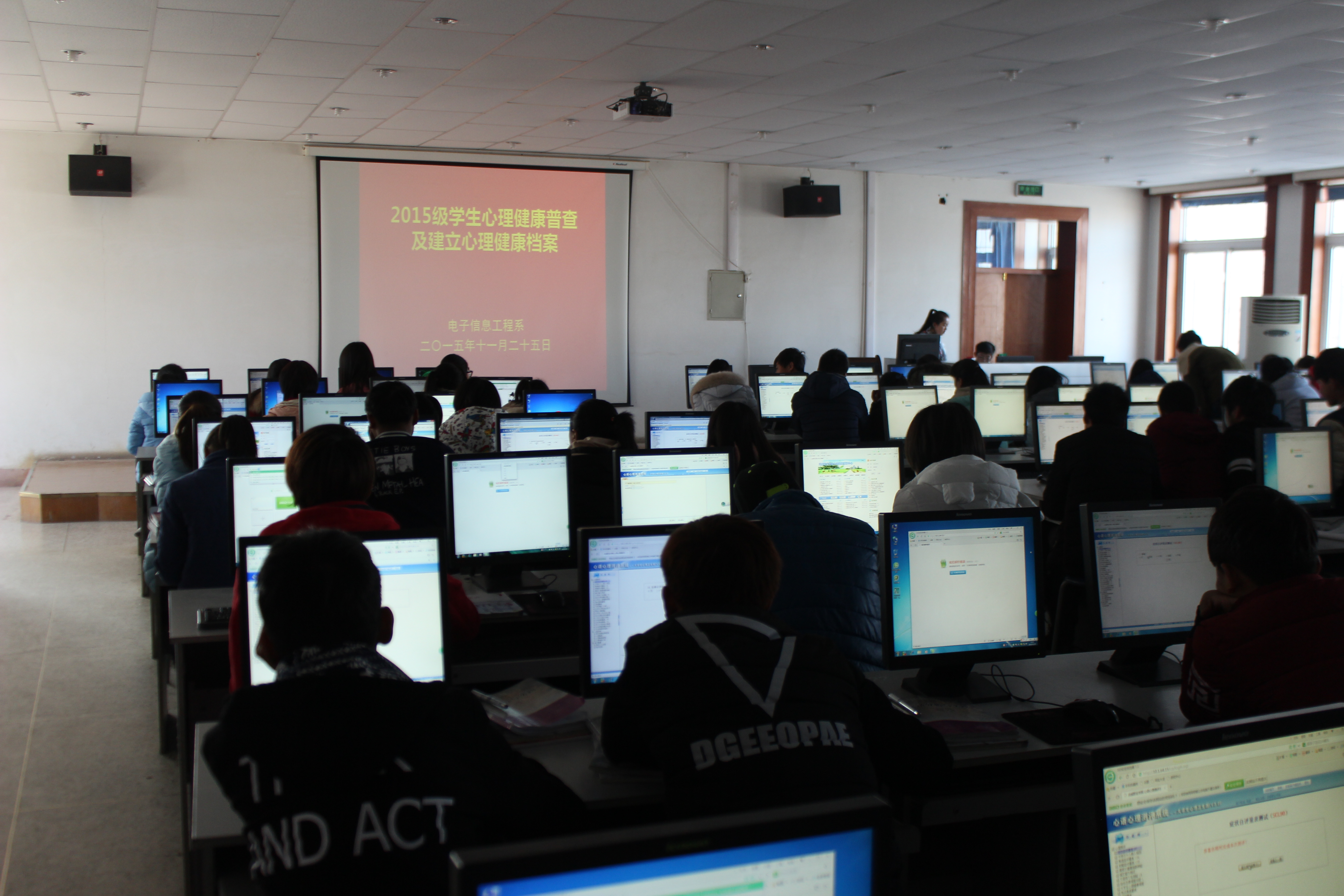 為及時掌握2015級學(xué)生的心理健康狀況,有針對性地進(jìn)行心理健康教育,按照學(xué)院心理健康普查安排及要求,11月25日12時10分,電子信息工程系組織2015級學(xué)生226人在尚德樓十號機(jī)房完成了心理健康狀況普測工作,并為每個同學(xué)建立了心理健康檔案。