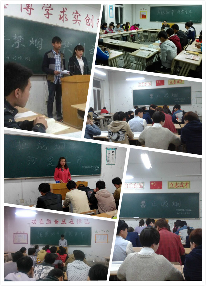 在班會中,各班主任向同學們宣讀了學院《關于在校園內(nèi)公共場所戒煙的通知》和《校園禁煙倡議書》,并提出作為一名學生,除了要有遠大的理想、高尚的情操、淵博的知識、嚴謹?shù)募o律作風外,還要有一個健康的身體。為了我們的健康,我們呼吁,同學們應自覺的遠離香煙,并勸說吸煙的親友盡快戒煙。讓我們每一位同學做出承諾,自覺拒絕煙草,遠離煙草危害。堅決不吸煙,拒吸第一支煙,勸告他人不吸煙,不做吸煙的新一代。人人爭做文明、健康、遵紀守法的好學生,使每一位師生都擁有一個健康的生活環(huán)境。