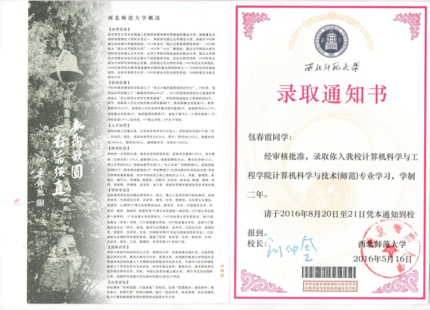 近日傳來(lái)喜訊,我系13級(jí)計(jì)算機(jī)應(yīng)用大專班包春霞同學(xué)在2016年甘肅省專升本考試中,被西北師范大學(xué)計(jì)算機(jī)科學(xué)與工程學(xué)院錄取。