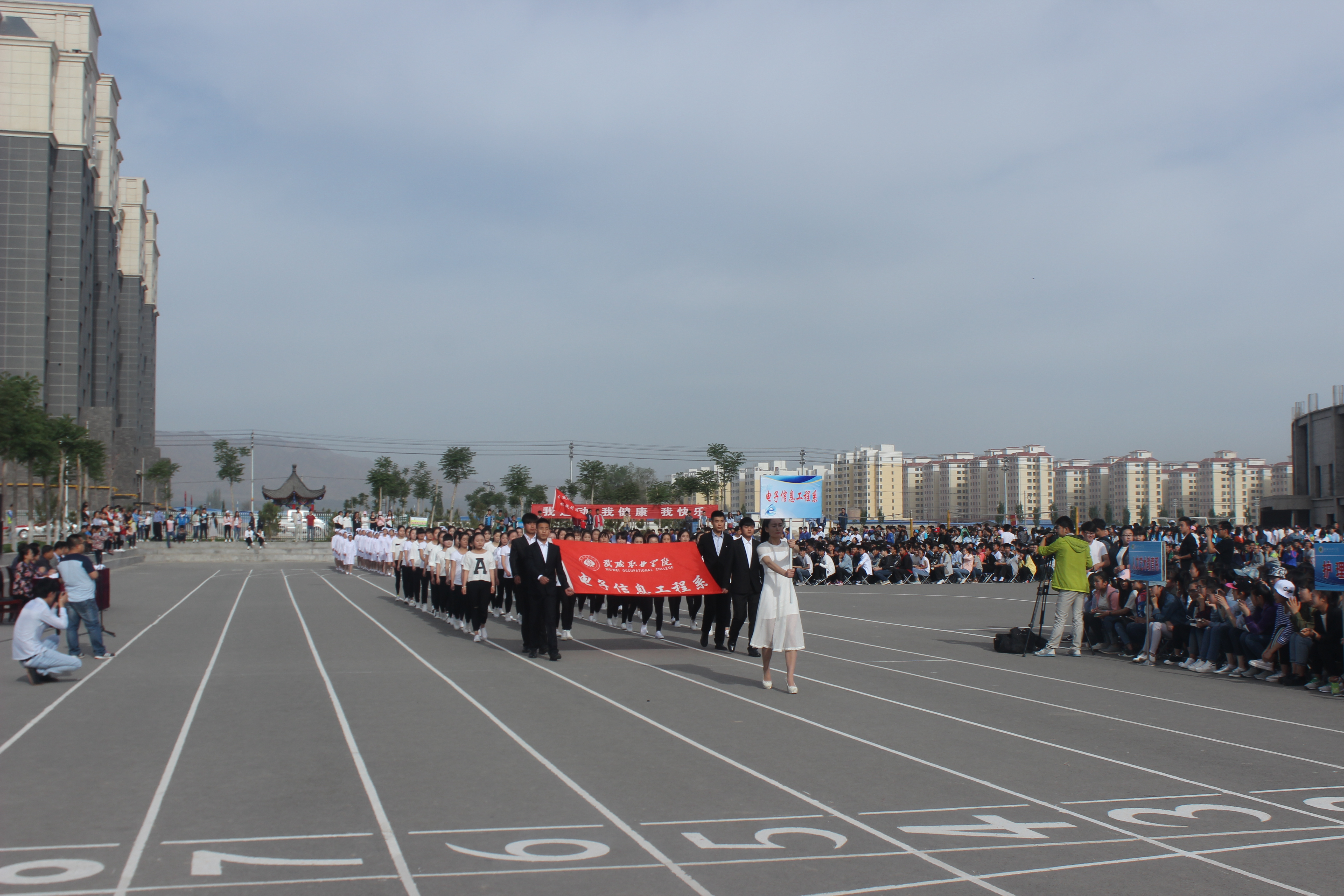 5月18日早8:30,我系195名運(yùn)動健兒參加了2016年武威職業(yè)學(xué)院春季運(yùn)動會開幕式。56名青年學(xué)子身著統(tǒng)一服裝,托起系旗,喊著“賽出風(fēng)格,賽出水平;團(tuán)結(jié)拼搏,爭創(chuàng)佳績”擲地有聲的口號,行進(jìn)劃一的隊形,邁著矯健的步伐,進(jìn)入運(yùn)動會開幕式現(xiàn)場,我們以鏗鏘有力、整齊劃一、昂揚(yáng)向上的精神面貌贏得了主席臺領(lǐng)導(dǎo)和觀眾們不斷的掌聲。
