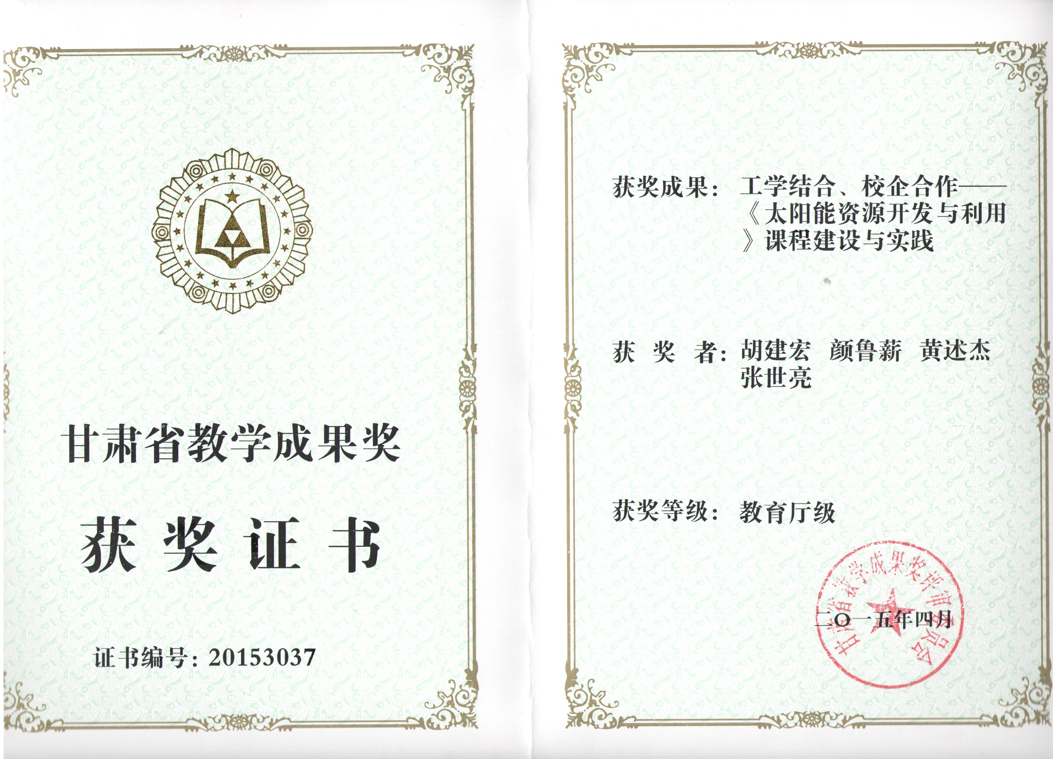 《太陽能資源開發(fā)與利用》課程建設(shè)與實踐榮獲甘肅省教學(xué)成果獎