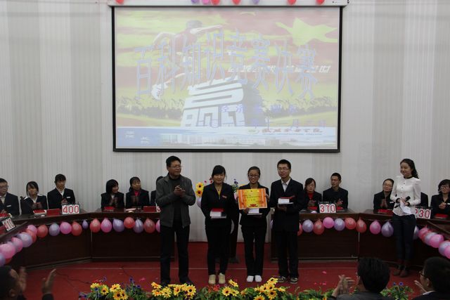 競賽結束后,王院長揭曉了本次比賽的全部獎項,并對比賽中各代表隊的不俗表現給予了高度評價。他認為經濟管理系本次“百科知識競賽”集知識性與趣味性于一體,既豐富了學生的課余生活又拓寬了學生的知識面,在大學校園中非常必要,以后要多舉辦類似的活動。隨后,經管系黨總支白書記作了總結講話,白書記首先對本次競賽取得圓滿成功表示祝賀,向在百忙之中抽出時間來參加活動的領導及老師表示衷心的感謝,并對本次組委會師生付出地辛勤勞動予以肯定!白書記希望,全體同學能以此次知識競賽活動為契機,勤奮學習、苦練技能,奮力拼搏,成為優(yōu)秀的應用性人才。