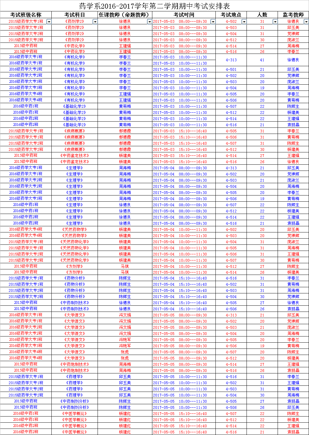 藥學系2016-2017學年第二學期期中考試安排表