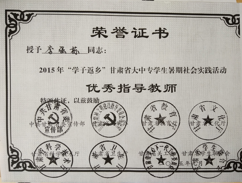 李強(qiáng)棟榮獲2015年“學(xué)子返鄉(xiāng)”甘肅省大中專學(xué)生暑期社會實踐活動優(yōu)秀指導(dǎo)教師