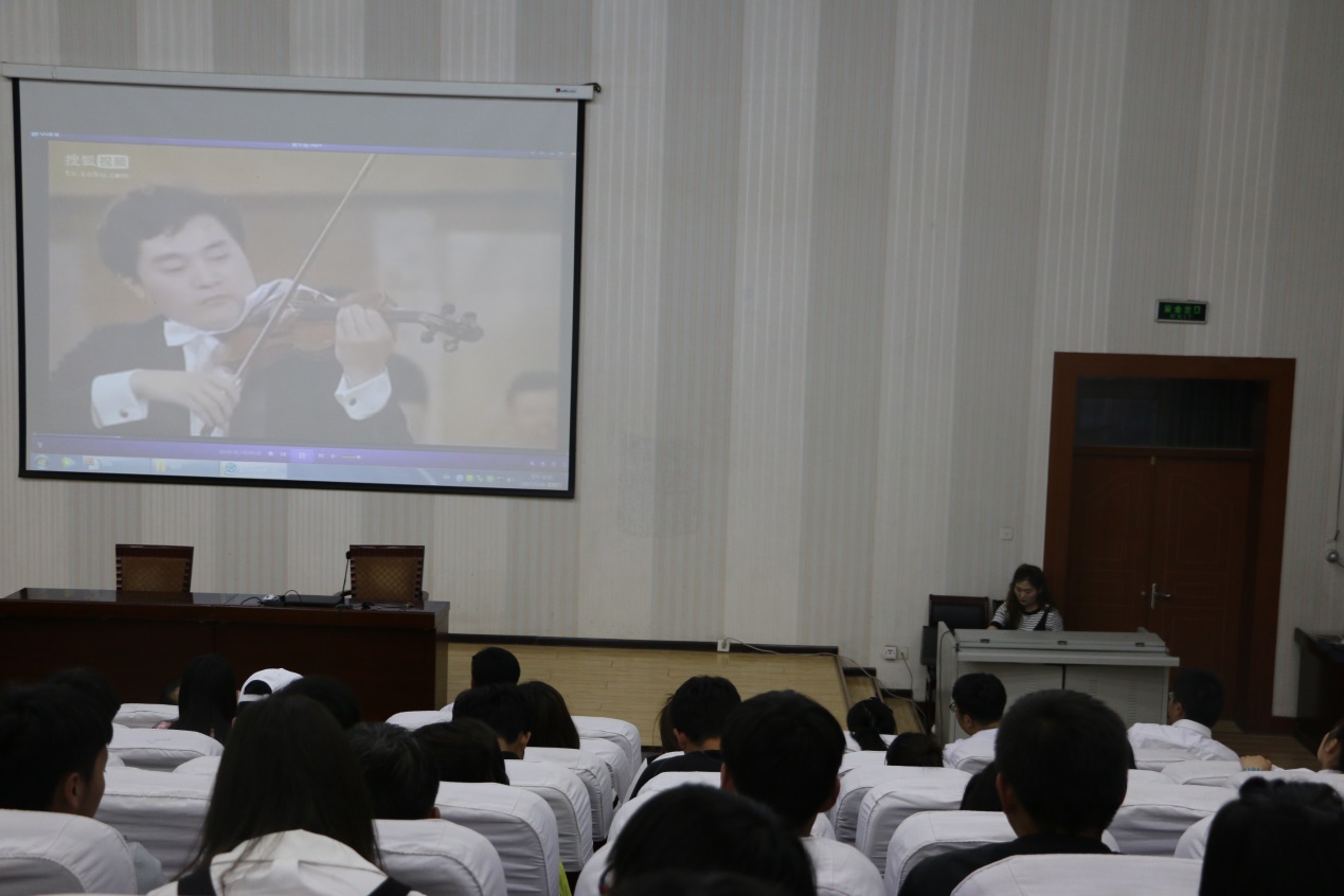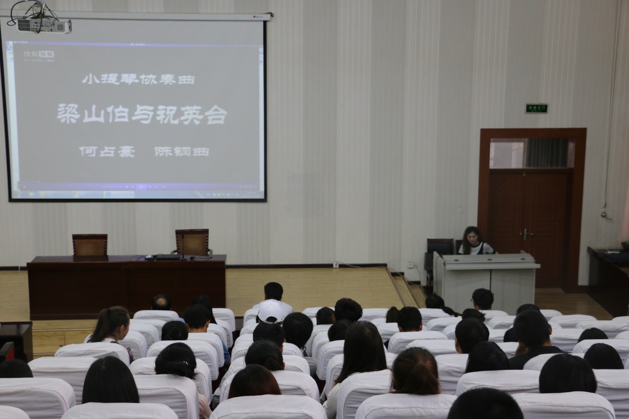 伴著優(yōu)美的音樂旋律王敏副教授開始了講座,王老師首先介紹了音樂發(fā)展歷史和音樂鑒賞的基礎(chǔ)知識(shí),然后以我國著名作曲家陳鋼、何占豪先生創(chuàng)作的小提琴協(xié)奏曲《梁山伯與祝英臺(tái)》為題材,分階段講述了“鳥語花香”、“草橋結(jié)拜”、“英臺(tái)抗婚”、“投墳化蝶”等內(nèi)容和藝術(shù)場(chǎng)景。剖析了作品在管樂、和以小提琴、大提琴為主的弦樂及民樂有機(jī)結(jié)合的高超藝術(shù)境界,講座過程中王老師結(jié)合《梁?!穮f(xié)奏曲音視頻資料,演繹了梁山伯與祝英臺(tái)凄美的愛情故事。
