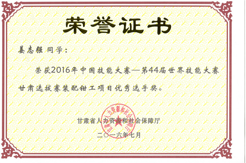 第44屆世界技能大賽甘肅選拔賽裝配鉗工項(xiàng)目優(yōu)秀獎(jiǎng)
