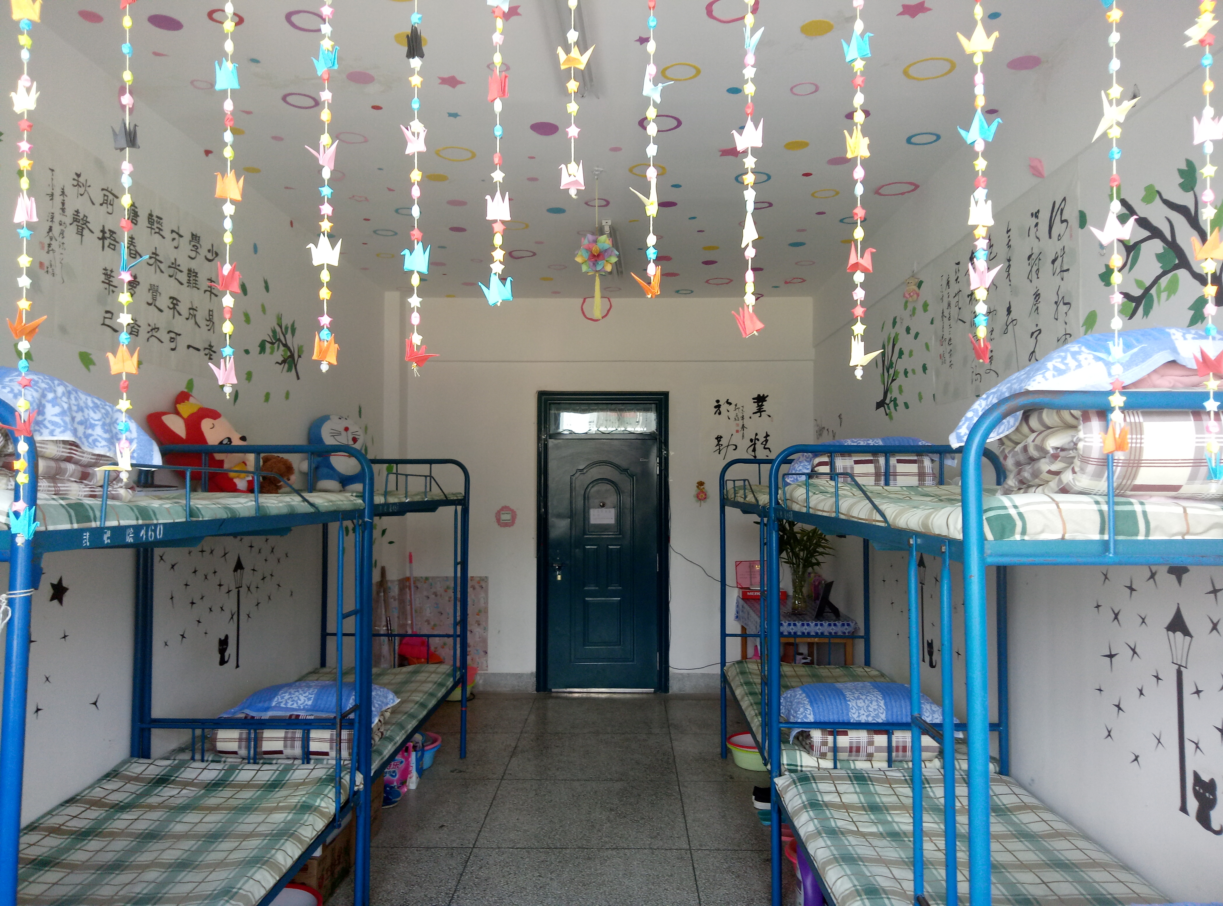 各宿舍衛(wèi)生狀況普遍較好,基本做到了勤開(kāi)窗,勤掃除,被褥疊放整齊,地面、桌面干凈整潔,用電合理、安全。同學(xué)們大膽創(chuàng)新利用剪紙、剪花、圖貼等手工作品將宿舍裝扮得優(yōu)雅而漂亮。也有同學(xué)用書(shū)法、繪畫(huà)作品裝扮宿舍,為宿舍增添了藝術(shù)的氣息。
