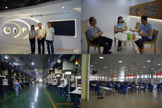 晶科能源控股有限公司是全球為數(shù)不多的擁有垂直一體化產(chǎn)業(yè)鏈的光伏制造企業(yè),業(yè)務(wù)涵蓋了優(yōu)質(zhì)的硅錠、硅片、電池片生產(chǎn)、高效單多晶光伏組件制造以及光伏電站建設(shè)等領(lǐng)域,是目前全球光伏組件生產(chǎn)的龍頭企業(yè),2016年中國500強企業(yè)。公司負責人帶領(lǐng)考察人員參觀了公司現(xiàn)代化的生產(chǎn)車間、晶科商學(xué)院、員工宿舍和食堂,介紹了公司的發(fā)展情況和用人需求。在考察過程中,考察人員就公司給學(xué)生提供的工作崗位、待遇、住宿、安全管理等情況與企業(yè)負責人進行了深入交流。