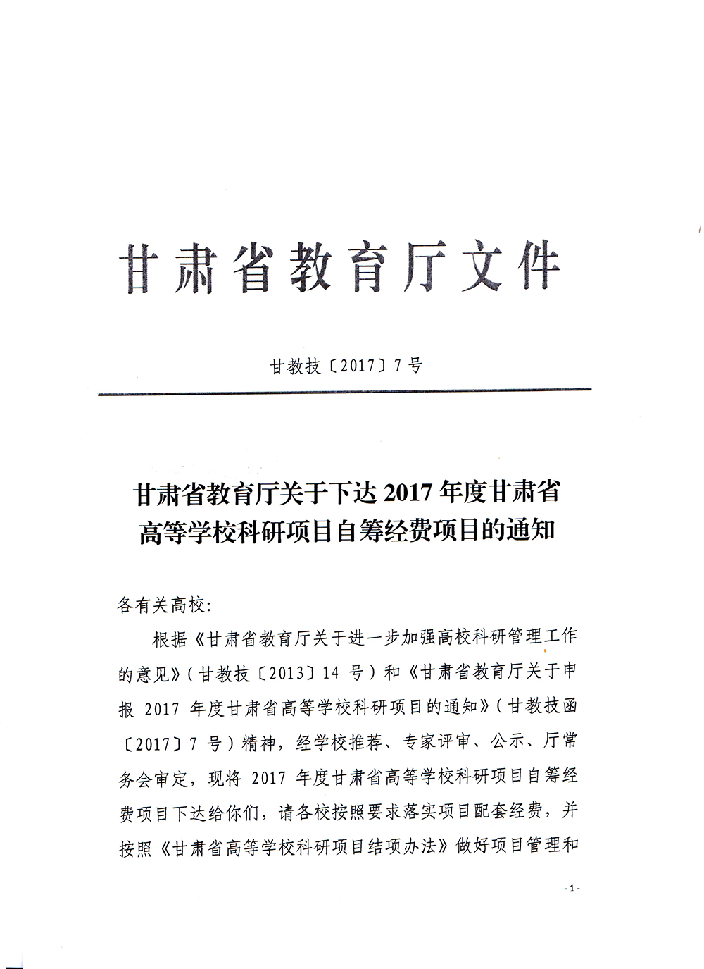 轉(zhuǎn)發(fā)甘肅省教育廳《關(guān)于下達2017年度甘肅省高等學校科研項目自籌經(jīng)費項目的通知》