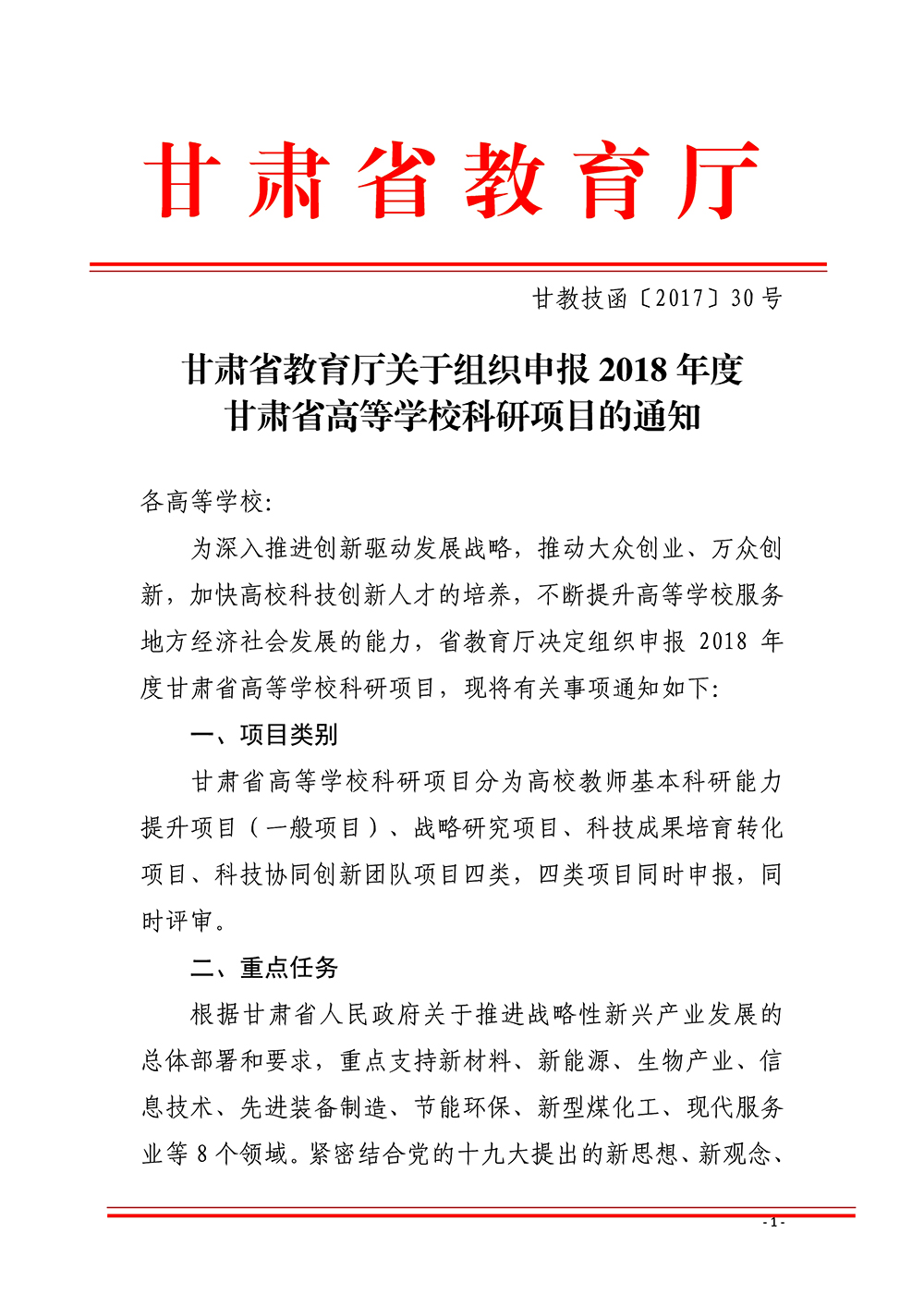 轉(zhuǎn)發(fā)甘肅省教育廳關(guān)于組織申報2018年度甘肅省高等學校科研項目的通知