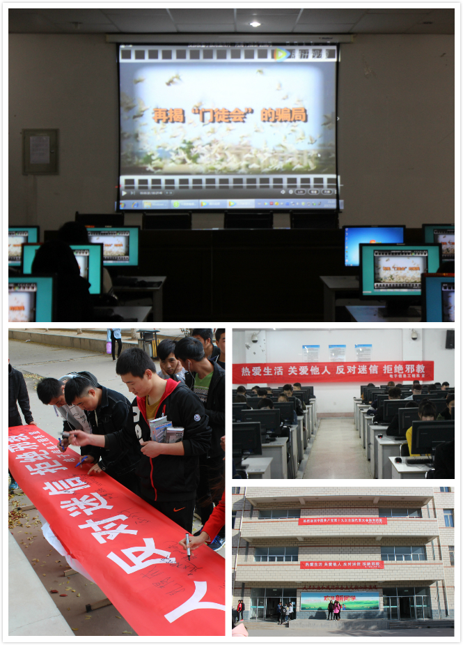 為了建設(shè)和諧校園,維護(hù)社會(huì)穩(wěn)定,凈化教育系統(tǒng)校園,電子信息工程于10月30日晚,在尚德樓11號(hào)機(jī)房開(kāi)展了反邪教宣傳片放映活動(dòng)。