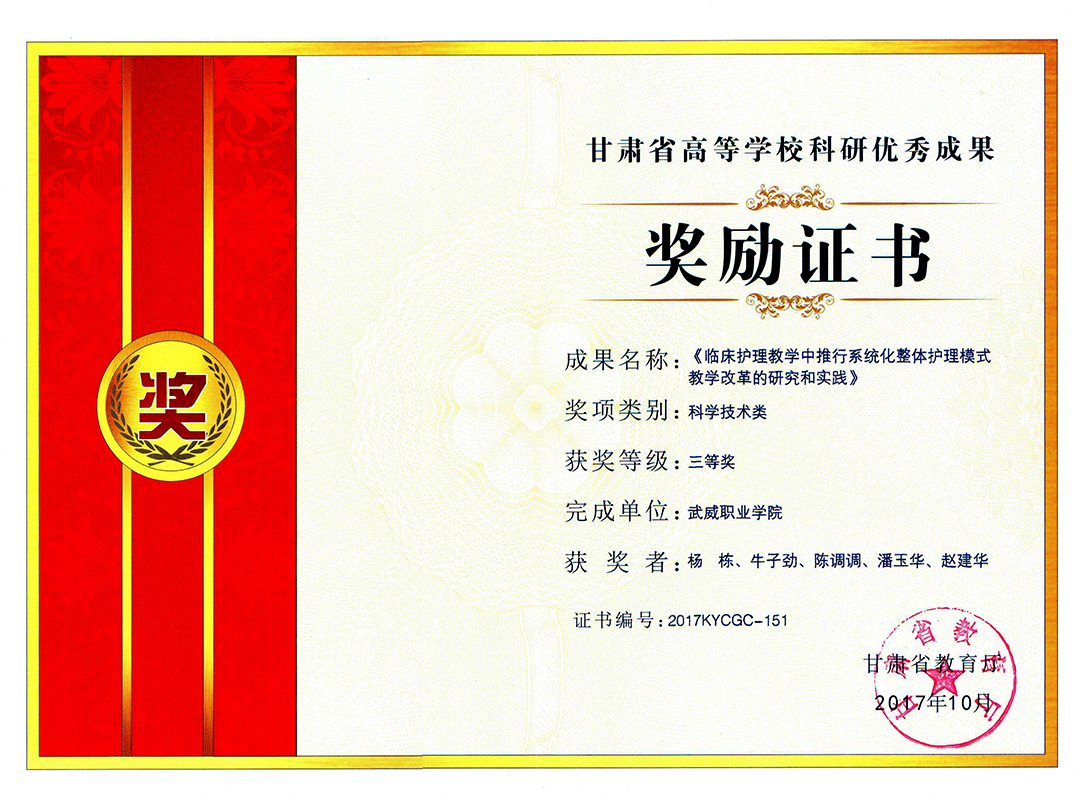 2017年度甘肅省高等學(xué)校科研優(yōu)秀成果獎(jiǎng)勵(lì)證書(shū)