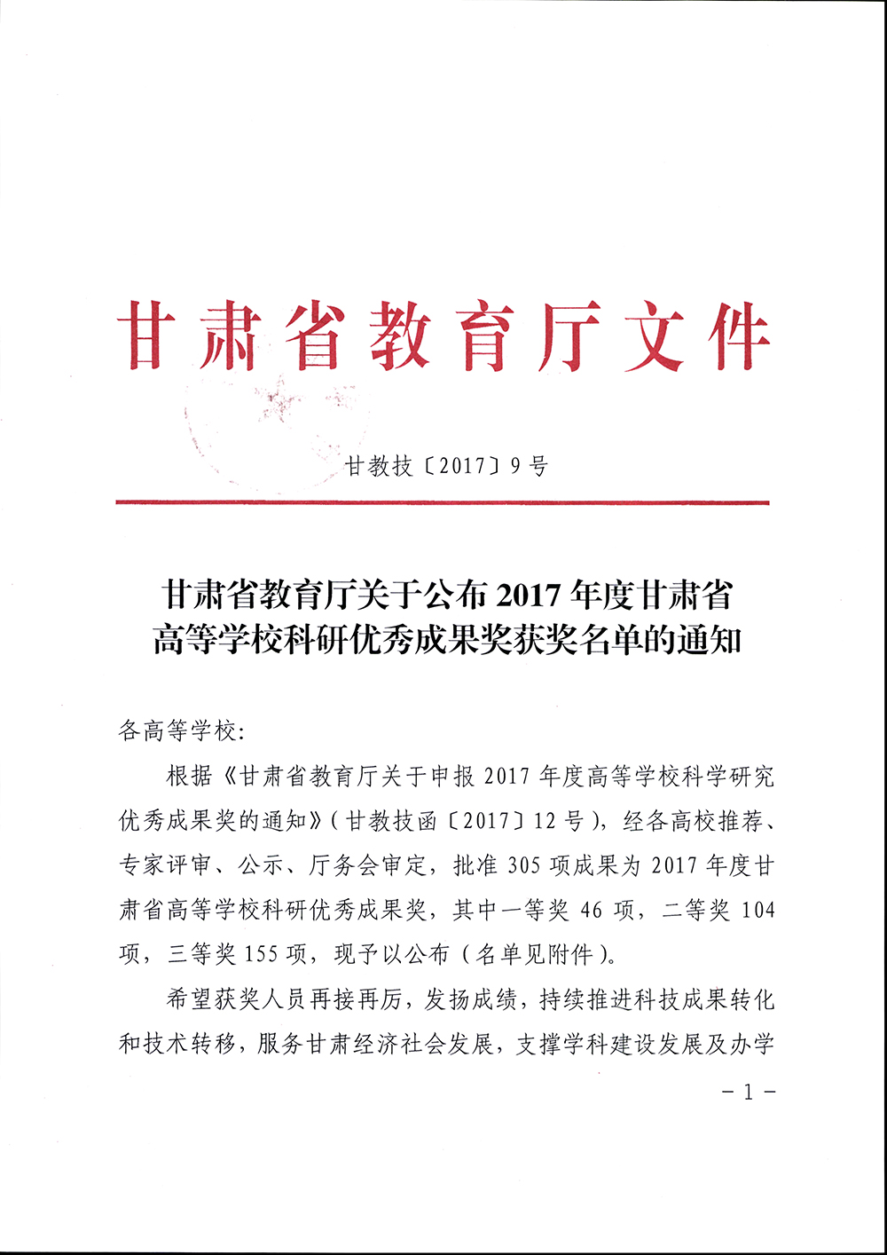 轉(zhuǎn)發(fā)甘肅省教育廳關(guān)于公布2017年度甘肅省高等學(xué)??蒲袃?yōu)秀成果獎(jiǎng)獲獎(jiǎng)名單的通知