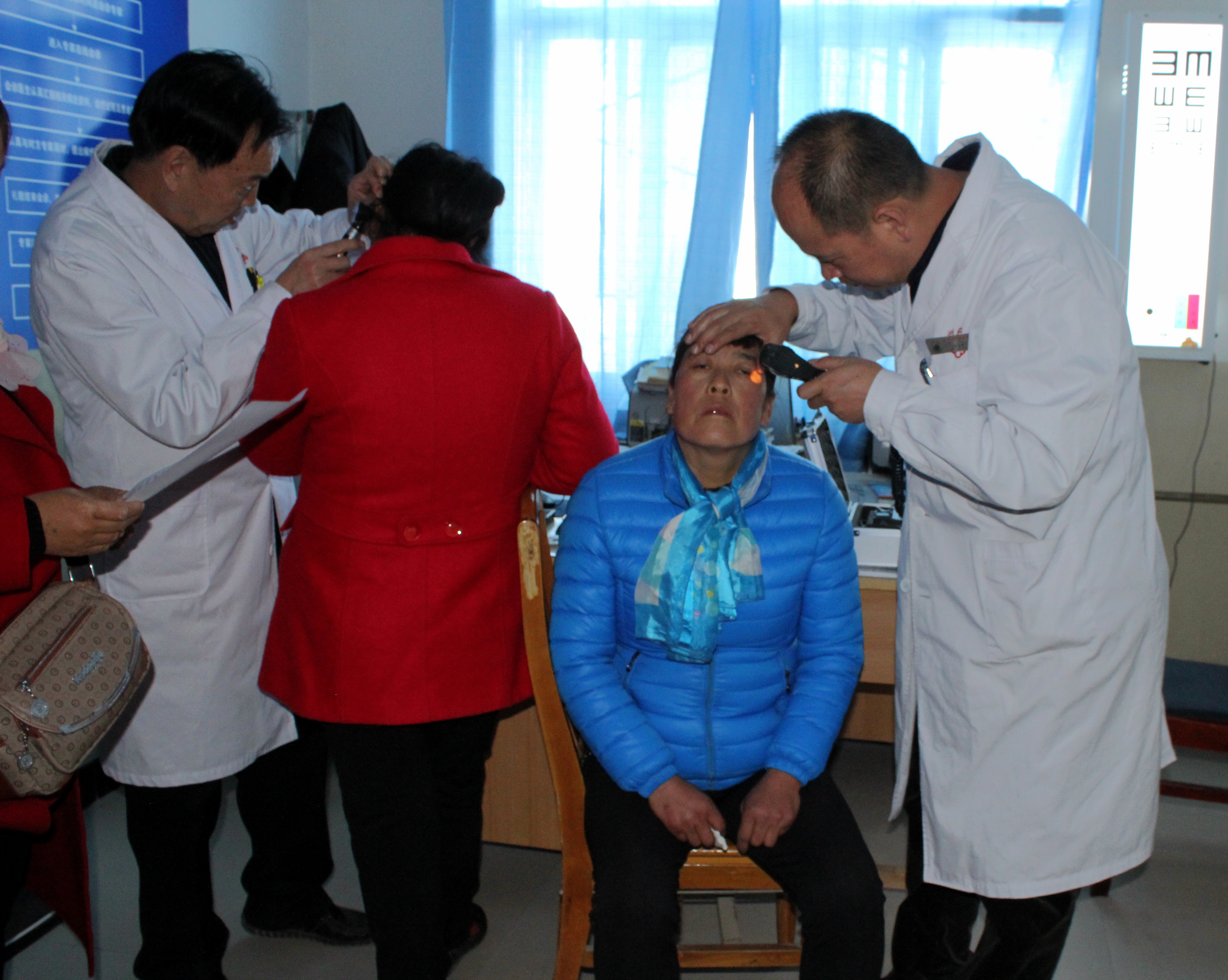 在衛(wèi)生院內(nèi)義診現(xiàn)場(chǎng),由于診室面積所限,患者們遵照護(hù)士安排意見,按病種分成兩組排隊(duì)候診。陶醫(yī)生為患有干眼癥、結(jié)膜炎、白內(nèi)障、青光眼、翼狀胬肉、斜視等眼科疾病的患者開展常規(guī)檢查,并開具處方,提供健康用眼衛(wèi)生和治療方案。王醫(yī)生為患者提供耳鼻喉常規(guī)檢查服務(wù)。對(duì)于患有中耳炎、慢性咽炎、耳鳴耳聾、過敏性鼻炎等疾病的患者,王醫(yī)生現(xiàn)場(chǎng)給予用藥指導(dǎo)和今后的治療方案。