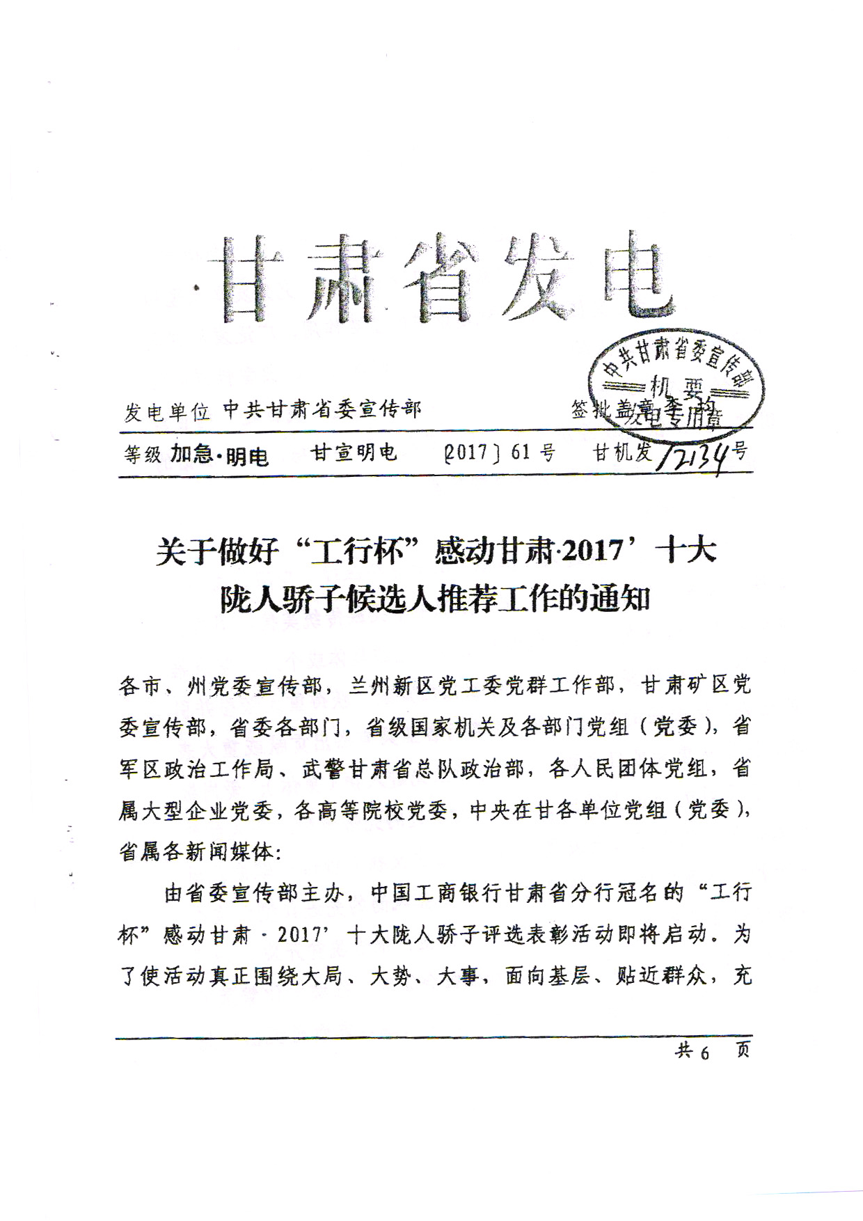 關于推薦“工行杯”感動甘肅?2017十大隴人驕子候選人的工作通知