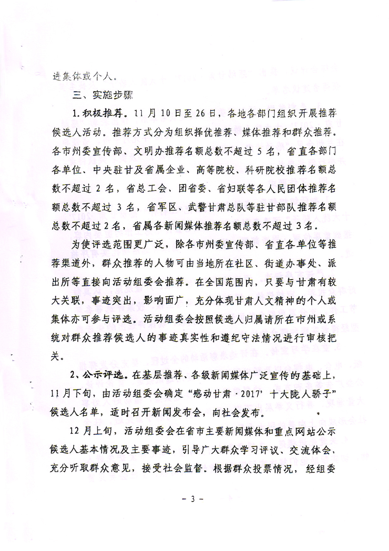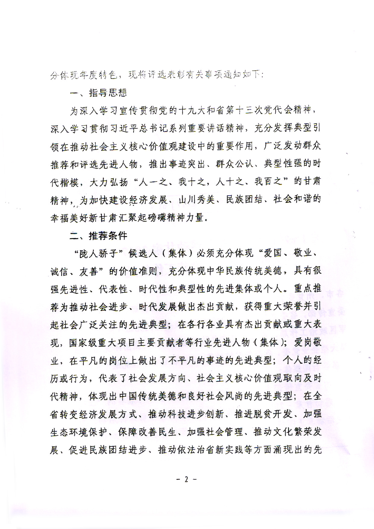 2.推薦對象必須按照《中共甘肅省委宣傳部〈關于做好‘工行杯’感動甘肅·2017十大隴人驕子候選人推薦工作的通知》中的推薦條件確定。