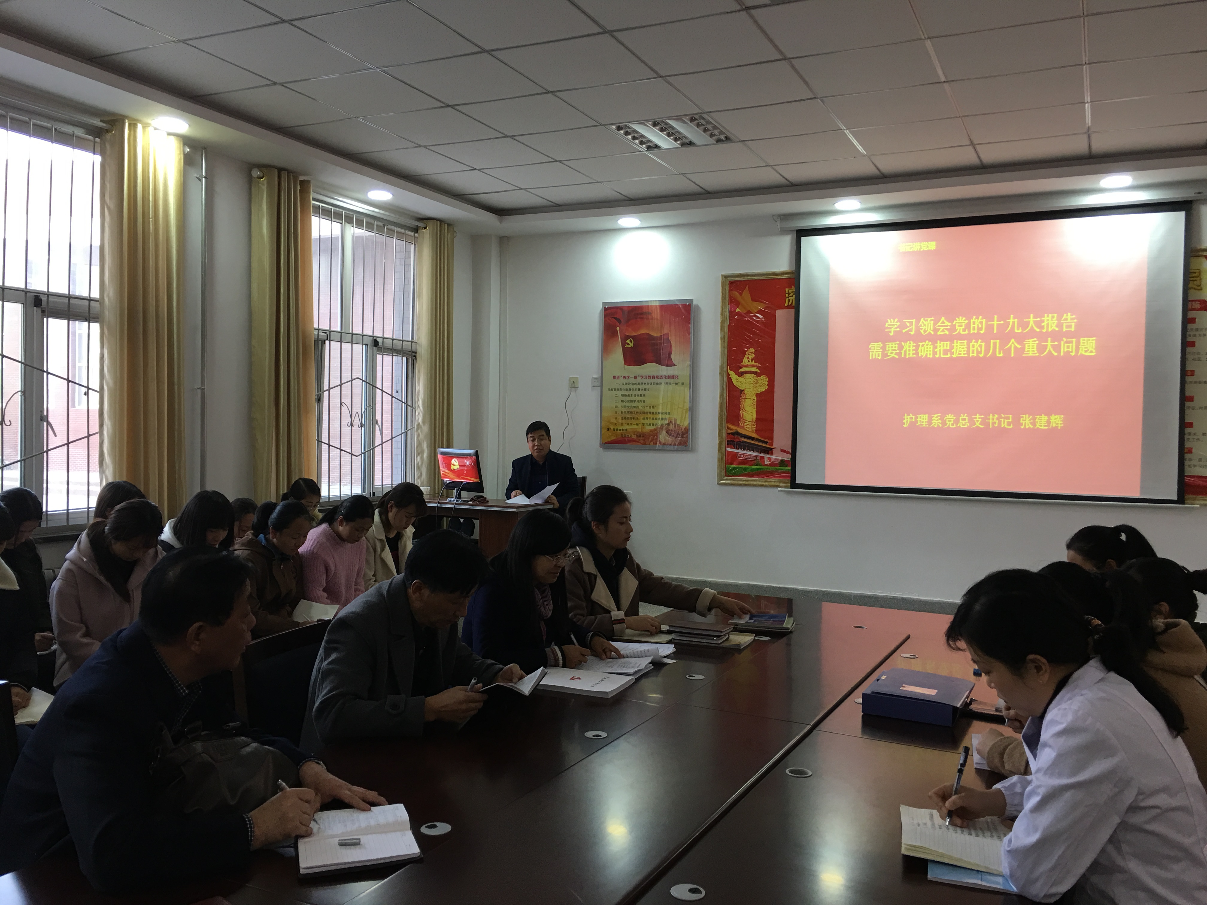 11月17日,護理系黨支部支召開全體黨員大會,黨總支書記張建輝講黨課,就《學(xué)習領(lǐng)會黨的十九大報告需要準確把握的幾個重大問題》進行專題黨課輔導(dǎo),促進全體黨員對十九大精神的學(xué)習理解。護理系入黨積極分子聆聽了黨課。
